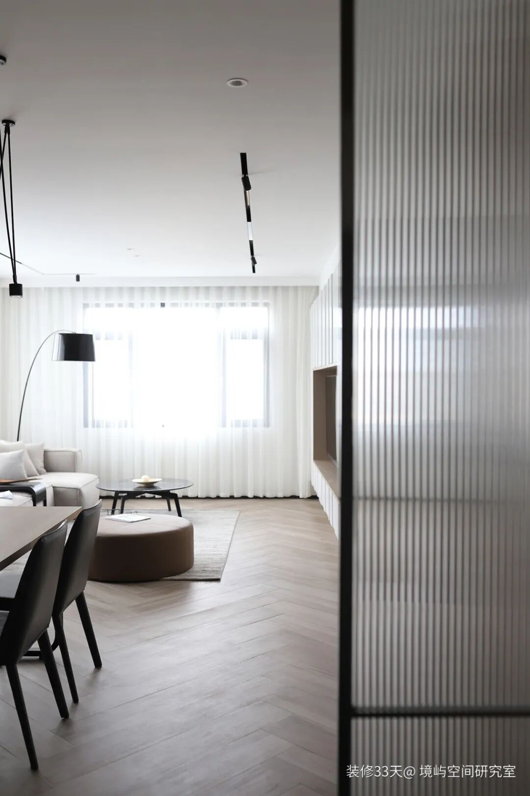 ▲ 入户设计一面长虹玻璃屏风做隔断,缓冲进门视线,人字拼木地板与极简大平顶延伸视觉效果