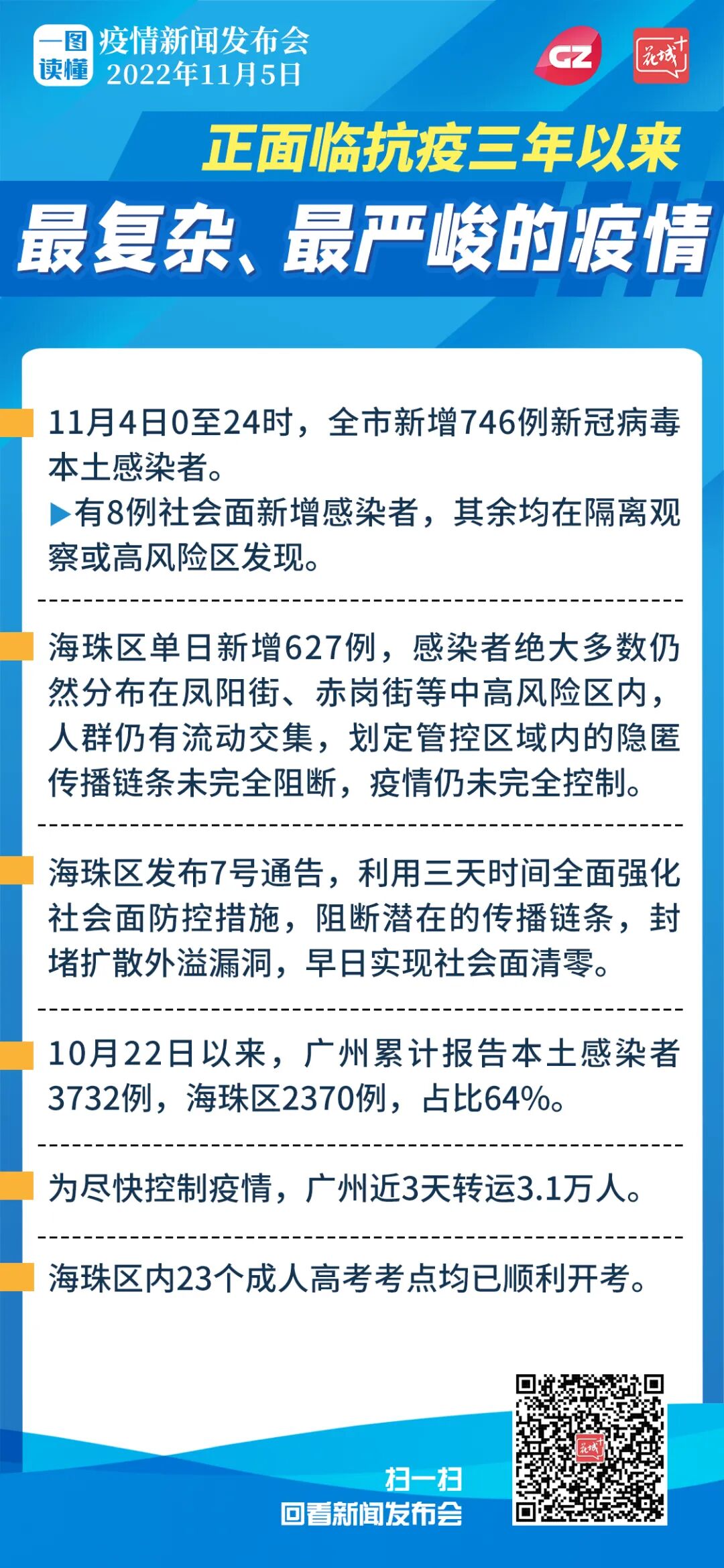海珠区是广州本轮疫情中最严峻的地区。11月4日0时至24时,广州新增746例新冠病毒本土感染者,其中,海珠区单日新增627例,感染者绝大多数分布在凤阳街、赤岗街等中高风险区内,划定管控区域内的隐匿传播链条未完全阻断。