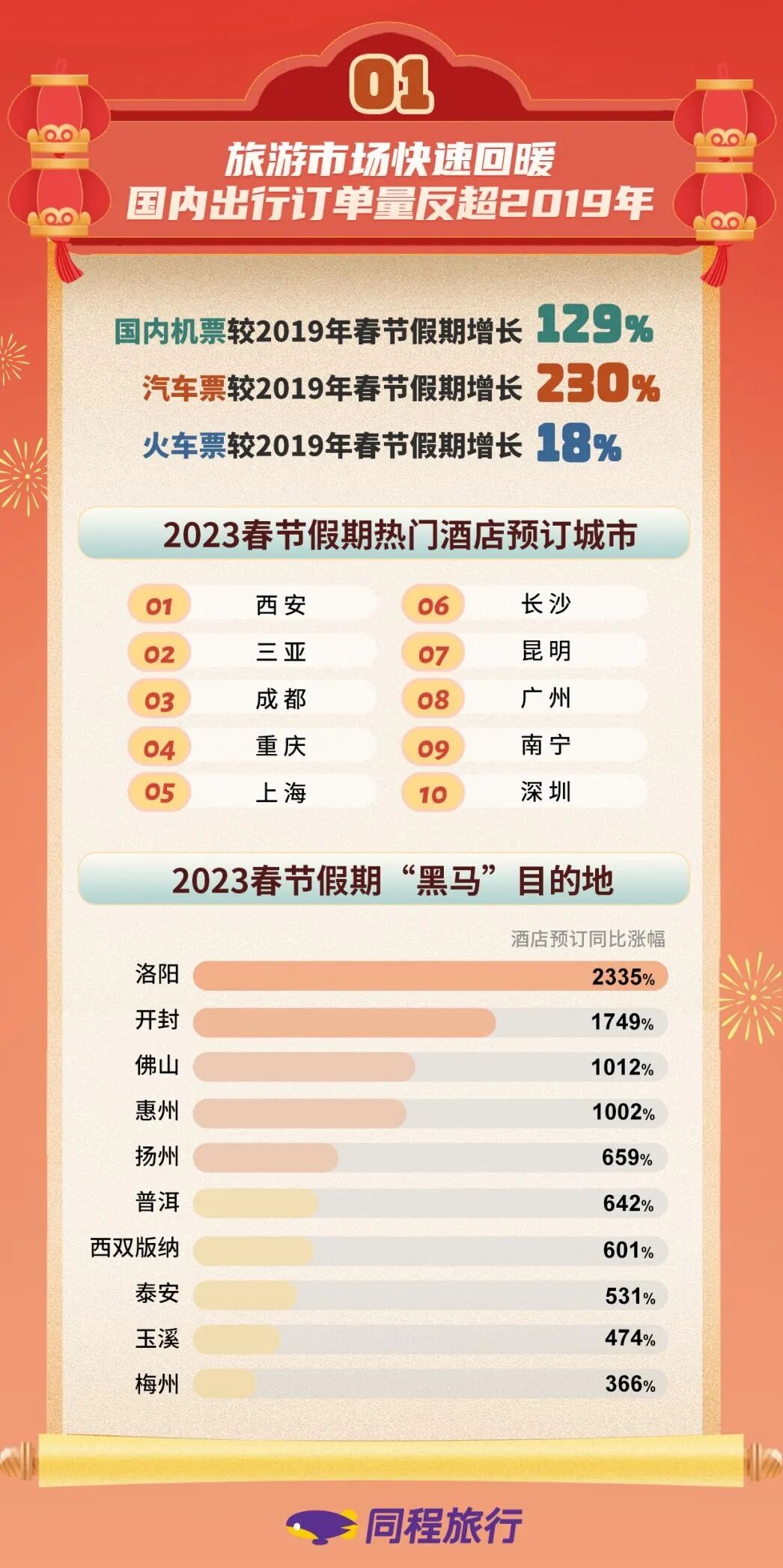 1月27日上午,同程旅行发布《2023春节假期旅行消费数据报告》(以下简称“报告”)。报告显示,在多重政策利好释放后的第一个春节假期,旅游市场迎来爆发,机票、火车票、汽车票订单量反超2019年同期。同程旅行数据显示,2023年春节假期,同程旅行平台国内机票预订量较2019年同期增长129%,汽车票预订量较2019年同期增长230%,火车票预订量较2019年同期增长18%。今年春节期间,国内长线游迅速复苏,出境游市场呈现快速增长的态势。短途周边游市场保持活跃。![]()