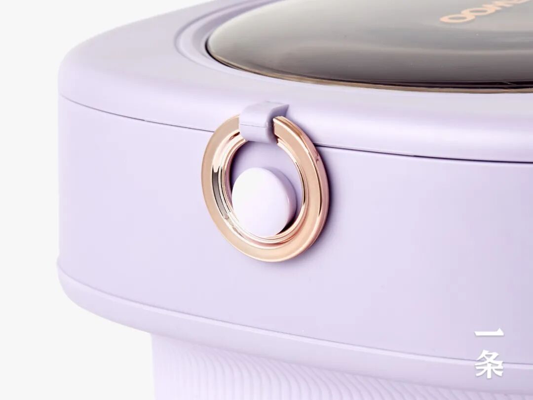 这款折叠洗衣机拿到手就让人忍不住感叹:质感做得太棒了,大宇对细节的把控真是越来越好了!洗衣机顶部采用了半透明视窗设计,不仅拉高颜值,还能一目了然地看到里面衣物的状态。盖子左右各1个玫瑰金色的卡扣,洗衣时可以牢牢卡住主机,避免溅水。本文为推广![]()