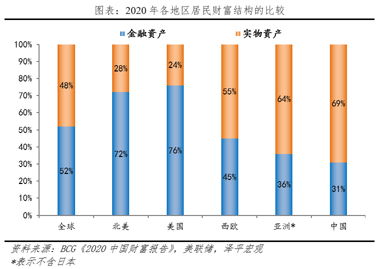 北美成熟市场以金融资产为主,中国房地产投资占比偏高。北美地区的金融市场较为完善,投资渠道相对便利。而我国重视“家”的文化传统,加之过去房价持续上涨带来的“硬通货”心理,使得我国居民更倾向于持有实物资产。根据BCG《2020中国财富报告》,2020年全球、北美、西欧、亚洲(不含日本)的金融资产在总资产中占比分别为48%、28%、55%和64%。美国金融资产投资占比高于北美地区,2020年金融资产占比达76%。中国投资更侧重实物资产,2020年实物资产投资占比高于亚洲,为69%。