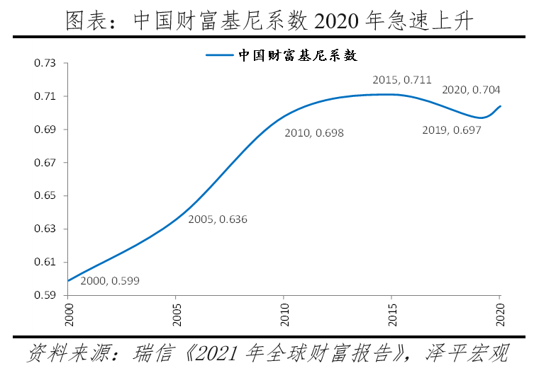 财富“马太效应”,大众群体财富增速低于高收入群体。根据瑞信《2021年全球财富报告》,中国财富基尼系数从2000年的0.599持续上升至2015年的0.711,随后有所缓和,降至2019年的0.697。但2020年疫情冲击下,量化宽松的货币政策下不同资产的涨幅不同,拉大了贫富差距,中国财富基尼系数上升到0.704。