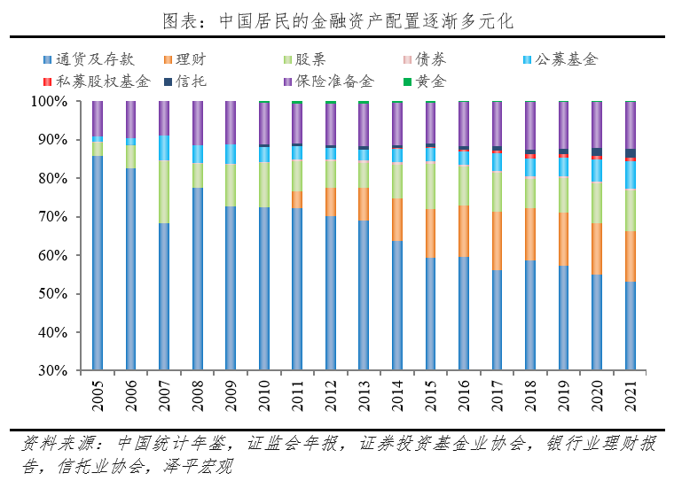 2)结构层面,金融资产占比较低,实物资产占近七成。2021年中国实物资产占总财富比重高达69.3%,主要表现为房地产,全国住房市值达到476万亿元;金融资产占比30.7%,随着金融创新深化和直接融资比重提升,2005-2021年居民持有的金融资产占比上升了5个百分点,但仍偏低,相比之下2020年全球、北美、西欧、亚洲(不含日本)的金融资产在总资产中占比分别为48%、28%、55%和64%。