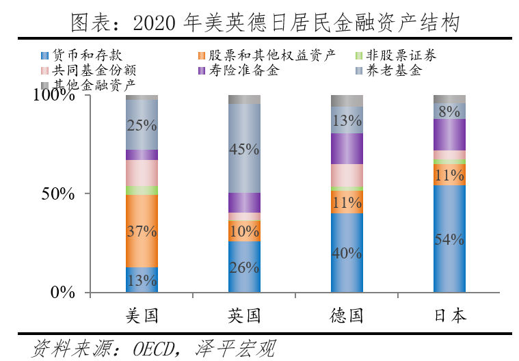 从国际比较看,中日德金融资产结构偏保守,英美较为均衡。美国居民资产配置中,37%配置于股票及其他权益资产,25%配置于养老基金,对存款、共同基金、寿险、债券等资产的配置也较为均衡。中国居民“储蓄为王”的意识仍强,2020年通货和存款在居民金融资产中占比高达54.9%,与日本的54%接近,高于德国的40%、英国的26%、美国的13%。
