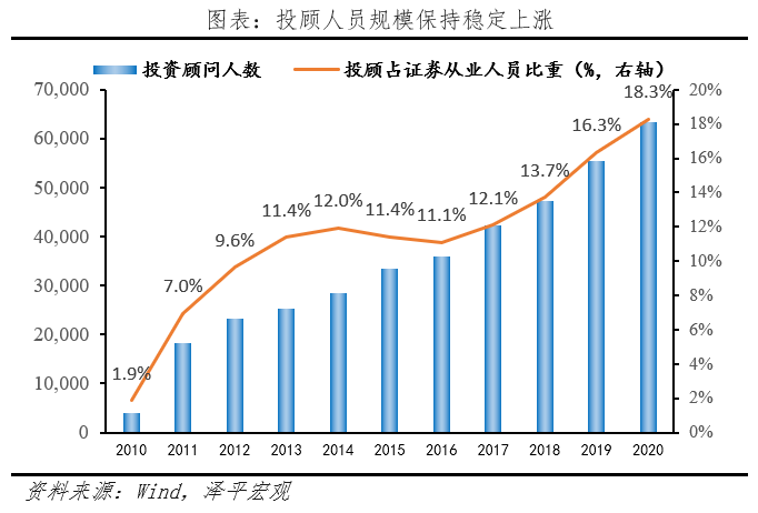 三是商业模式升级,以客户为中心的“买方投顾”模式将逐步普及。2010年投顾人数仅为3882人,在证券从业人员中占比不超过2%。2011年投顾人员规模较上年增长了370%,占比大幅抬升至7%。2011-2020年,投顾规模保持稳定上涨,2020年突破6万大关,年化增速达14.9%。