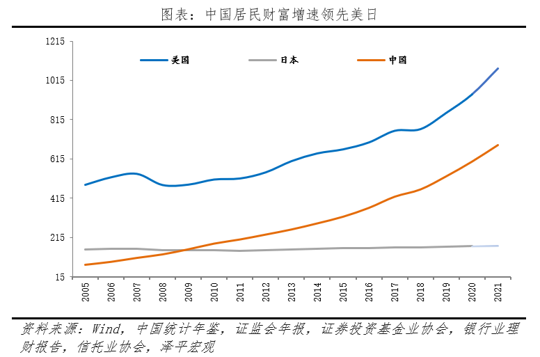 1)总量层面,2021年中国居民财富总量达687万亿人民币,2005-2021年年均复合增速高达14.7%,财富增速远超美日。户均资产约134.4万元,中国居民财富规模仅次于美国。