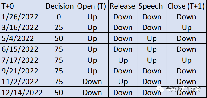 从T+0开盘到T+1收盘,道指在美联储定息会议前后的变动分别为:1月-342点,3月+829点,5月-174点,6月-643点,7月+665点,9月-743点,11月-575点和12月-884点。