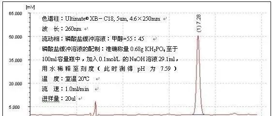 谱图上的内容主要包括:色谱柱、波长、流动相、温度、流速和进样量这几项。这意味着如果这几个色谱条件都确定下来了就可以基本认为这个方法已经开发成功,所以开发方法时我们可以通过逐一的考查这几个色谱条件来进行。