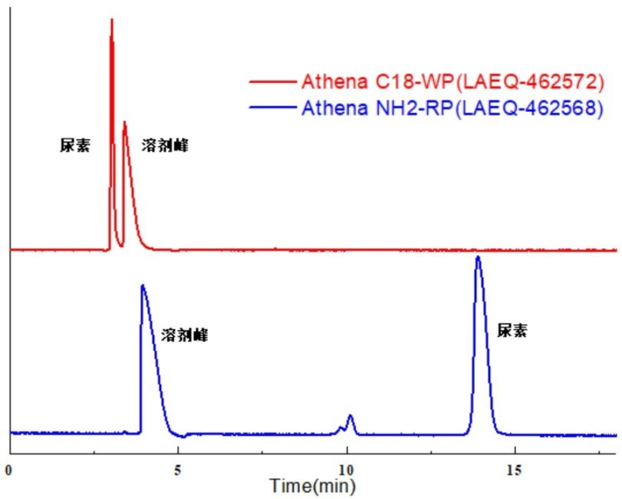 和反相色谱相比,Hilic色谱对极性大的水溶性化合物保留能力更强。极性较强的尿素,在Athena C18-WP (LAEQ-462572)没有保留,而在Athena NH2-RP (LAEQ-462568)可以很好的保留。