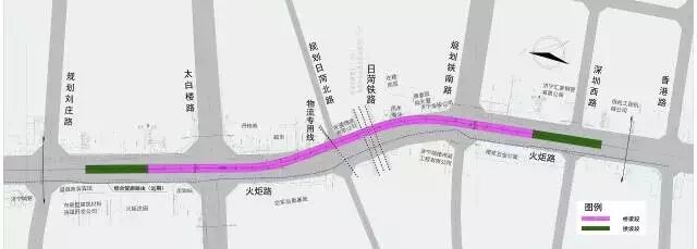 火炬路跨线桥工程覆盖面积相当广,跨线桥项目将建设在火炬路、铁路线之上。火炬路跨线桥呈南北走势,北起太白楼路以北,向南连续跨越太白楼路、货运场铁路线、日菏铁路、规划铁南路,在深圳路前接地。