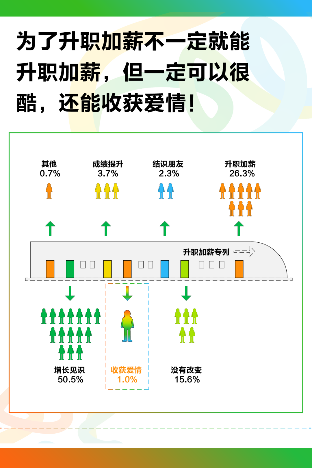在所有试图通过学习升职加薪的受访者中,有26.3%的人真的实现了升职加薪,但是也有更多的人收获了更酷更广阔的世界观、成绩提升、结识志同道合的朋友等;还有1.0%的人意外收获了爱情!不过也有15.6%的人表示自己暂时没有感受到明显的改变,但大象认为只要坚持就会有结果哦!