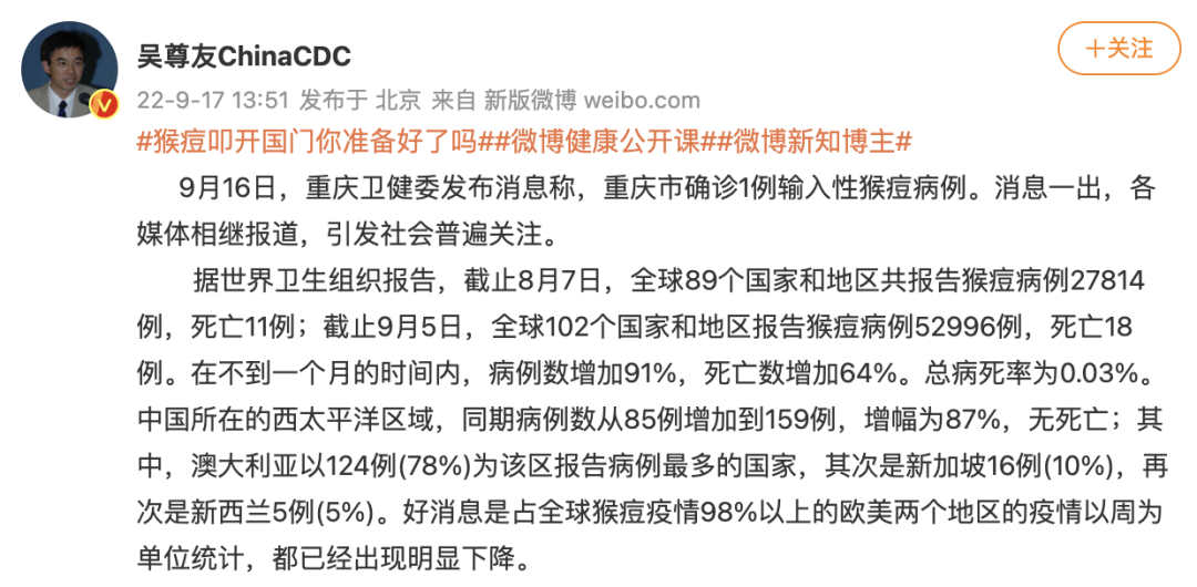 重庆报告中国大陆“首例”猴痘病例,是否还有漏网病例?9月17日,吴尊友在微博发文回应。全文如下: