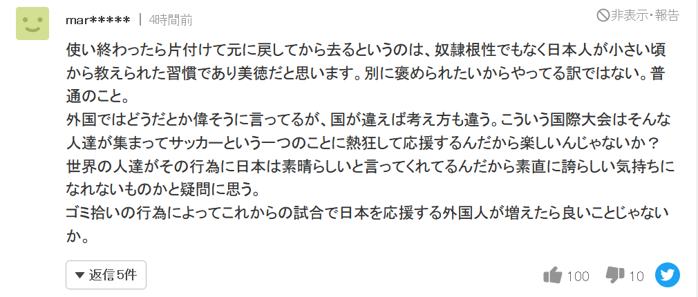 “因为全世界都在说日本(人)的这种行为很了不起,所以我也不禁感到骄傲。如果因为捡垃圾的行为,在今后的比赛中为日本加油的外国人也增加了,这不是好事吗?”