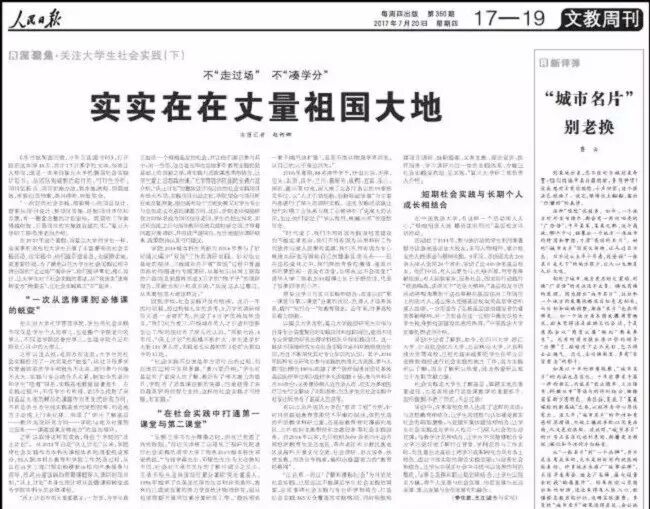 而就在不久前,《人民日报》刊发文章《不“走过场” 不“凑学分” 实实在在丈量祖国大地》,点赞通过社会实践了解国情民情的高校学子,报道了一批优秀的学生社会实践项目,赞扬光华管理学院推动“沃土计划”,使学生的社会实践经历了一次完美的“蜕变”:从往日很多学校普遍面临的学生积极性不太高、老师参与兴趣不太大、实践与专业结合不太紧,到如今的老师和学生“抢着”报名、实践基地数量显著提升。