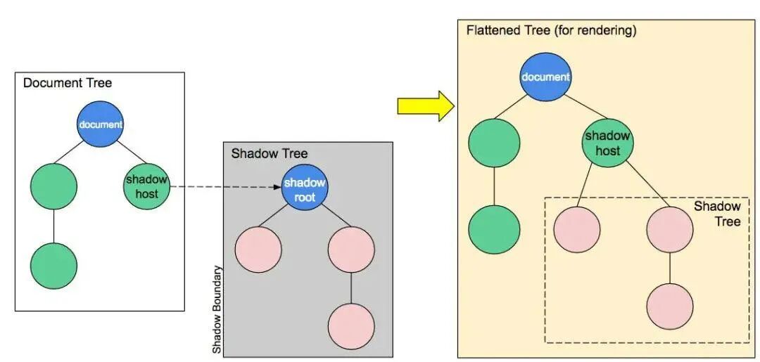}这里我们需要编写一个 class,该 class 并且要继承于 HTMLElement,然后我们在该类的构造函数里面,将我们书写的组件添加到 dom 树上。这里我使用 attachShadow 方法,再把 content 节点添加到 dom,attachShadow 的作用就是创建 shadow dom,这也是 web component 中很重要的一个概念 —— 影子 dom,它和我们一般的 dom 有所不同,我们可以通过这个方法创造一个相对封闭且独立的 dom,这个方法他会接收一个对象,对象的 mode 键值如果为 closed,那么这个 dom 就为与外界隔离,该 dom 以外的脚本也无法对其进行操控,下面的图片,就向我们展示了什么是 shadow dom。