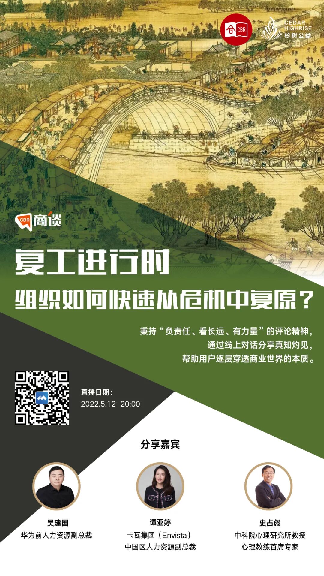 本期由《中欧商业评论》“新组织观察”工作室主理,5月12日20:00~21:30上线,特邀华为前人力资源副总裁吴建国、卡瓦集团(Envista)中国区人力资源副总裁谭亚婷、中国社会科学院心理研究所教授、心理教练首席专家史占彪,线上对谈“复工进行时,组织如何快速从危机中复原”。