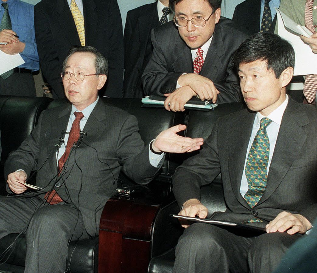 1998年12月31日,韩国政府与新桥签署《共识备忘录》后召开新闻发布会,左:韩国金监会主席李宪宰,右:单伟建。图源:《金钱博弈》