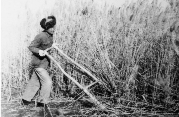 严冬时节,单伟建在戈壁已冰冻的湖上割芦苇