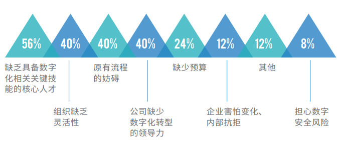 科锐国际和海德思哲联合推出的报告《从蓝图到伟业:中国企业数字化转型的思考与行动》中指出,人才和组织问题在影响公司数字化转型的内部因素中排名前列。56%的受访企业认为其缺乏具备数字化相关关键技能的核心人才,其次是组织缺乏灵活性、流程问题以及缺少数字化转型领导力等。