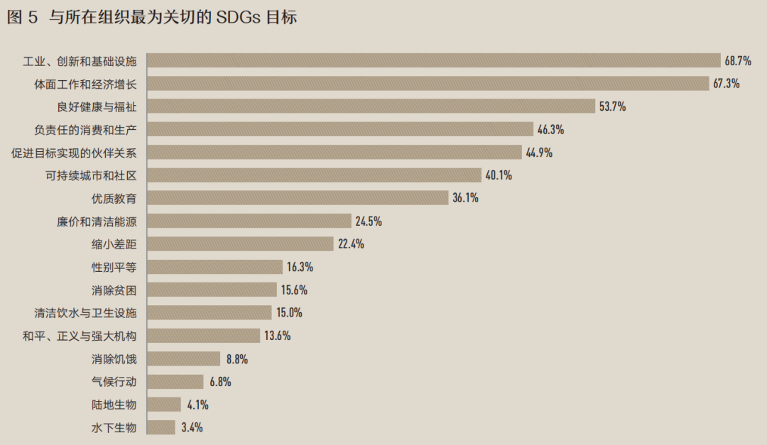 在17个联合国可持续发展目标(Sustainable Development Goals,SDGs)中,超半数的受访员工认为工业、创新和基础设施,体面工作和经济增长,良好健康与福祉是员工和所在企业最为关切的目标。这可以成为向园区内企业推广宣传ESG时的几个有效的切入点,逐步加强企业对其他目标重要性的认识和接受度(图5)。