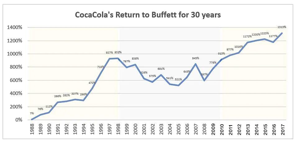 他赚钱最多的是1994年到1998年,此后连续数年,可口可乐表现乏善可陈,一直到2008年,重回上升轨道。
