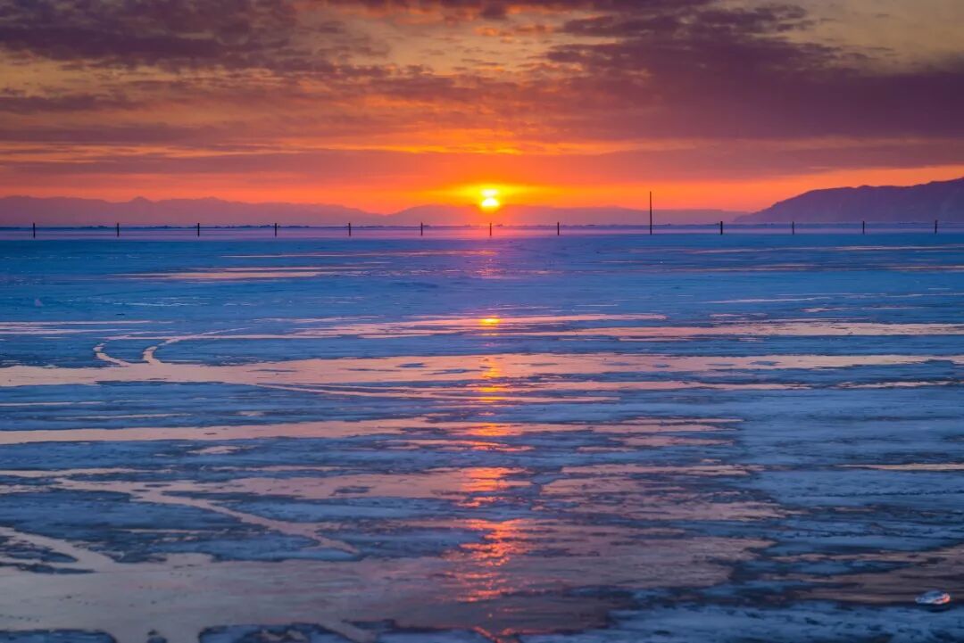 在冰封湖畔旁的小镇,利斯特维扬卡,等待一场冰原日落。