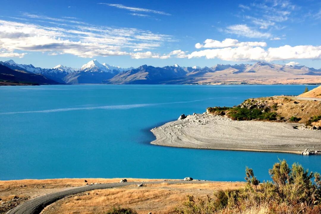 下面是小宝最爱的湖泊,叫做普卡基湖,Lake Pukaki(又是毛利语名字哦),这里最妙的就是她的颜色了,整个湖面呈现的是那种奶蓝色,甚至还会虽然阳光光线的不同而融合出不同的色彩。