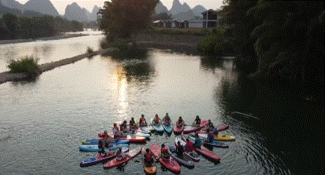 用桨板或皮划艇和山水亲密接触!不同于套路的游船漂流路线,这场水上体验更加自由、有趣。你可以玩各种水上游戏、水上瑜伽,也可以趴在上面,静享山水风景。