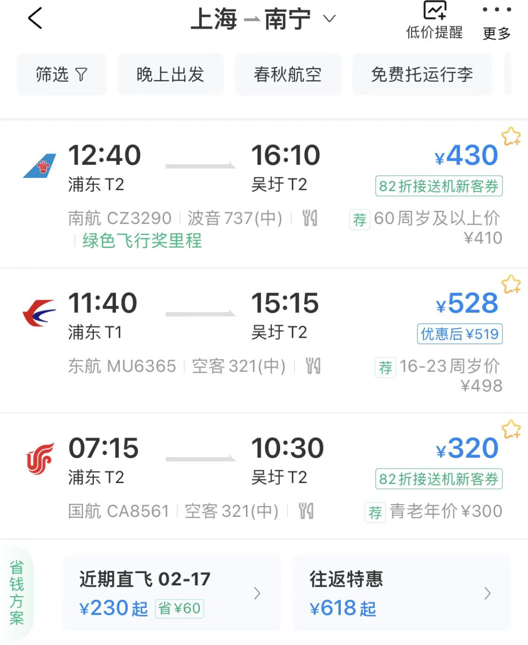 再一查,稻稻发现不止海南,广西云南等南方目的地的机票都相当便宜,单程基本都在两三百左右~