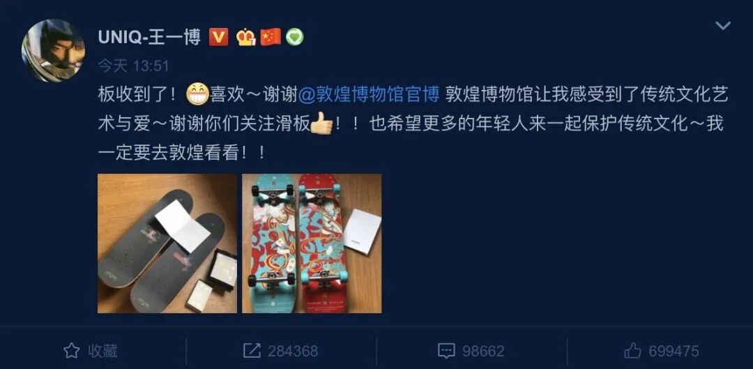 提到敦煌博物馆,很多人都会联想到明星王一博。此前,敦煌博物馆为王一博私人订制的两块网红滑板,通过敦煌壁画与极限运动相结合的设计,掀起了一场以敦煌文化为代表的传统文化消费热潮。“当年,滑板的爆火比较戏剧性。”韩佳汶告诉记者,敦煌是一个文化交汇的地方,所以当时团队在产品设计上产生一个想法,就是试着把传统文化与街头文化相结合。