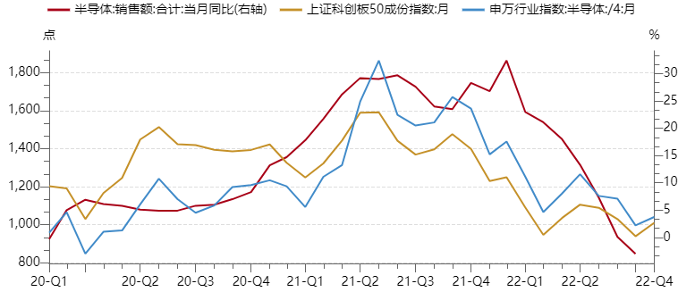 从半导体历史产业周期来看,中国半导体销售额同比增速与全球半导体销售额同比增速高度同步,9月增速均已转负,产业进入加速去库存。科创50成份股主要分布于半导体、芯片、计算机、新能源、医疗器械等行业,权重合计近7成,集中于半导体上下游。过去三年,科创50指数与半导体指数走势高度同步,未来半导体走势对科创50指数影响关键。