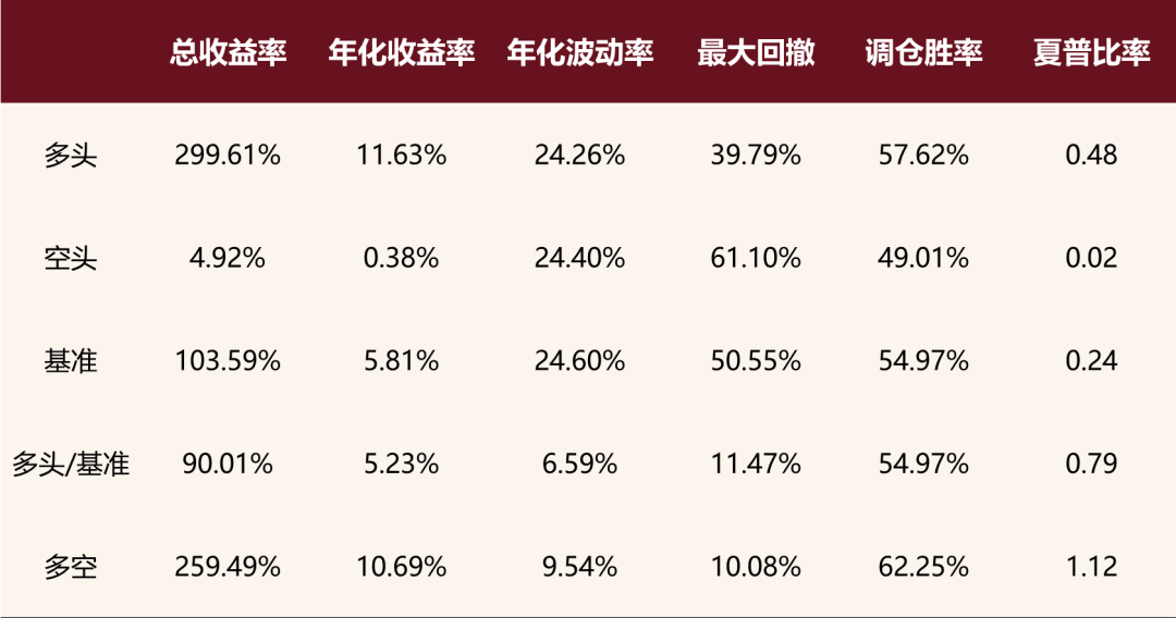 从分组测试结果来看,该指标多头超额年化收益达5.23%,信息比率为0.79;多空组合年化收益为10.69%,夏普比率为1.12。整体来看,该指标的绝对收益表现尚可,并且收益稳定性较高。