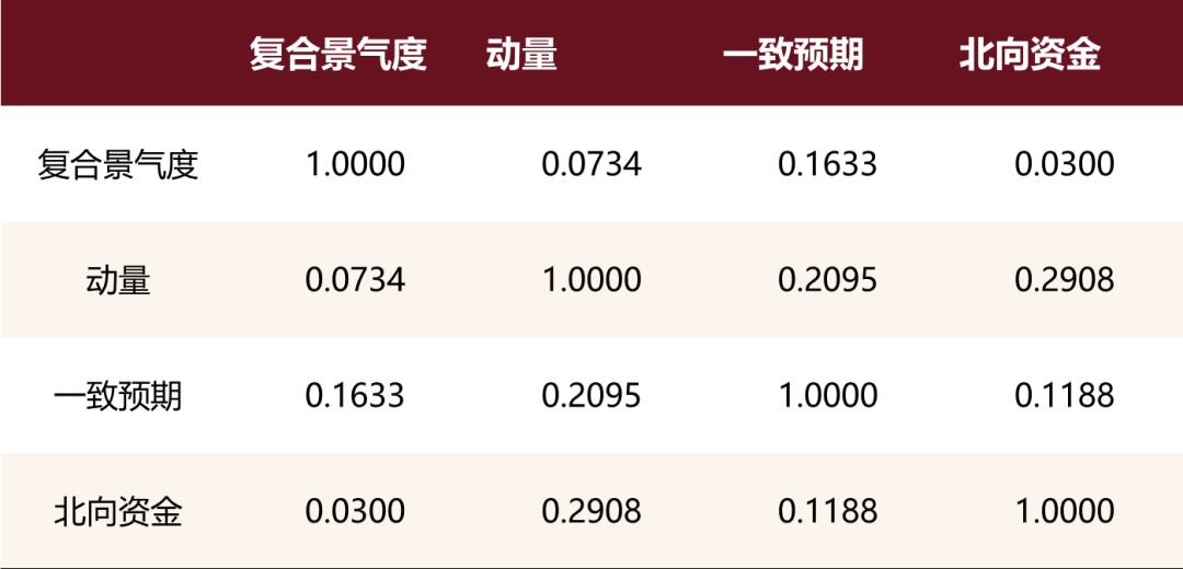 在构建行业轮动策略之前,我们先对该指标与原有模型做相关性分析。可以看到,几个指标之间的相关系数均不超过0.3,不存在显著的相关性。