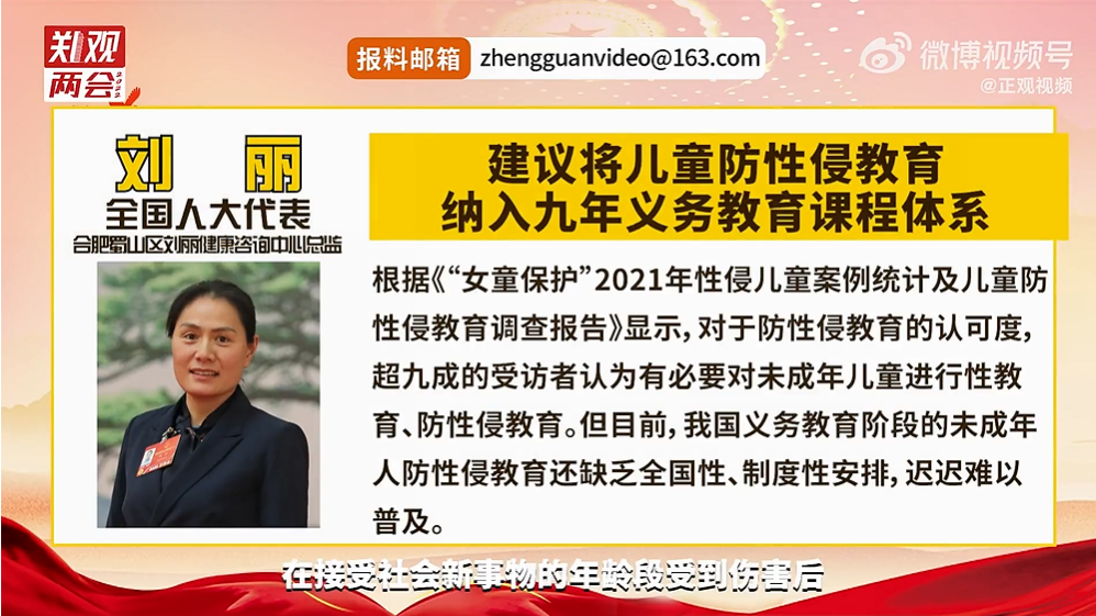 2022年3月10日,新京报报道,全国人大代表、合肥市蜀山区刘丽健康咨询中心总监刘丽建议将儿童防性侵课程纳入义务教育。刘丽认为,我国义务教育阶段的未成年人防性侵教育还缺乏全国性、制度性安排,迟迟难以普及。应在参考各地教育部门、公益组织实践的基础上,组织专家组,尽快研究出台全国性、权威性的儿童防性侵课本、教案。