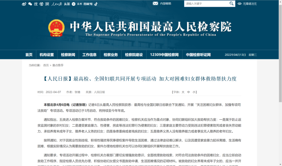 2022年4月6日,红星新闻报道,最高检与全国妇联联合下发通知,将于今年3月至年底共同开展“关注困难妇女群体,加强专项司法救助”的活动。