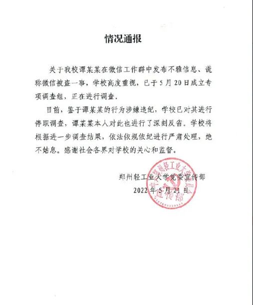 5月21日,郑州轻工业大学发布情况通告:已于5月20日成立关于谭某某事件的专项调查组,正在进行调查。鉴于谭某某的行为涉嫌违纪,学校已对其进行停职调查。学校将依据进一步调查结果,依法依规依纪进行严肃处理。