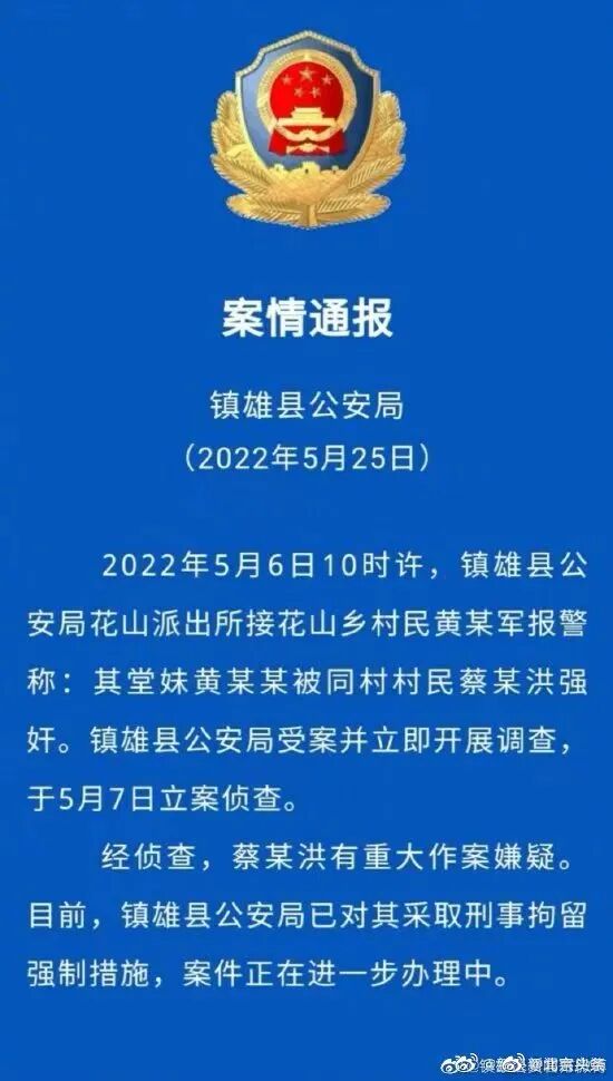 2022年5月25日,云南昭通市镇雄县公安局通报:2022年5月6日10时许,镇雄县公安局花山派出所接花山乡村民黄某军报警称:其堂妹小梦(化名)被同村村民蔡某洪强奸。镇雄县公安局受案并立即开展调查,于5月7日立案侦查。经侦查,同村村民蔡某洪有重大作案嫌疑。目前,镇雄县公安局已对其采取刑事拘留强制措施,案件正在进一步办理中。