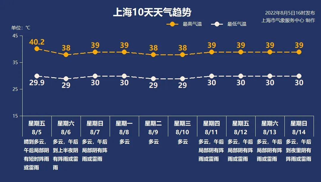 未来十天上海酷热高温天气持续,最低气温在30℃附近,极端最高气温仍可达40℃左右。白天黑夜都将被热浪包裹,防暑降温依然是首位。天气多云为主,双休日和下周后期多午后雷阵雨。