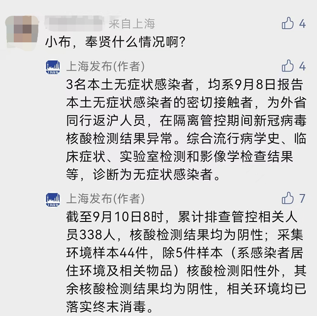 2022年9月9日,奉贤区无新增本土新冠肺炎确诊病例,新增3例本土无症状感染者,均系9月8日报告的本土无症状感染者的密切接触者,均在隔离管控中发现。