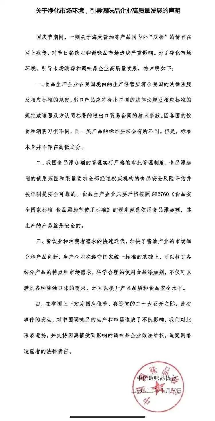 中国调味品协会10月5日也针对海天味业的相关争议发布声明。