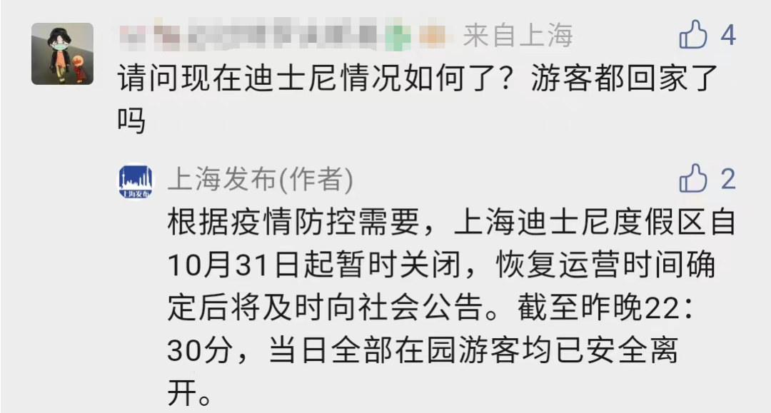 根据疫情防控需要,上海迪士尼度假区自10月31日起暂时关闭,恢复运营时间确定后将及时向社会公告。截至昨天22:30,当日全部在园游客均已安全离开。