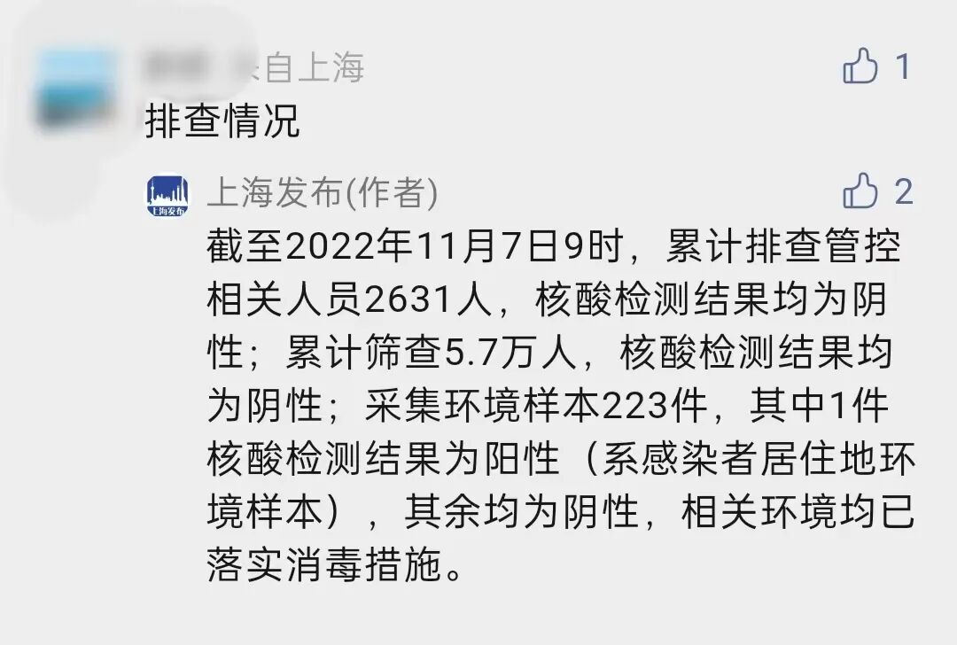 2022年11月6日0-24时,静安区无新增本土确诊病例,新增2例本土无症状感染者,其中1例无症状感染者在常态化核酸检测中发现(11月6日已发布),另1例无症状感染者在隔离管控中发现。均居住于: