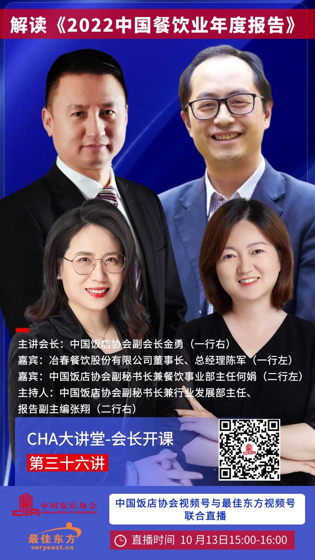 10月13日下午15:00-16:00中国饭店协会视频号,CHA大讲堂栏目将进行第三十六讲-会长开课,邀请中国饭店协会副会长金勇,副秘书长何娟,副秘书长兼报告副主编张翔,冶春餐饮股份有限公司董事长、总经理陈军做客大讲堂,全面解读《2022中国餐饮业年度报告》。