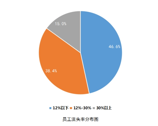 尽管员工人数总体增加,但餐饮行业人员流失率偏高的问题仍然存在,企业或在未来承担一定用工压力。报告显示,调研企业中员工年均流失率均值为19.30%,与去年数据基本持平。有53%的调研企业明确表示,其员工年均流失率高于12%。