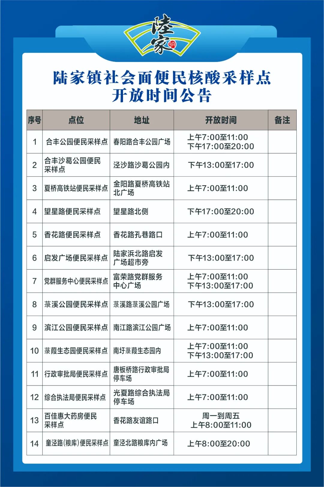1 | 艾·里中心同德堂大药房采样点 | 周一至周日 7:00-11:00 11:45-17:00 17:45-19:00 | 愿检尽检 | |