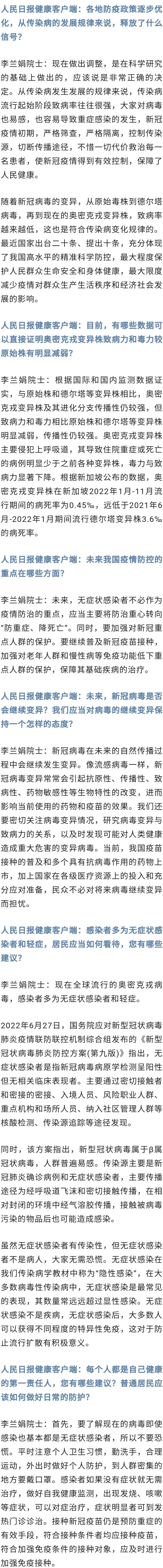 未来,无症状感染者不必作为疫情防治的重点,应当主要将防治重心转向“防重症、降死亡”。同时,要加强对新冠重点人群的保护。要继续普及新冠疫苗接种,加强对老年人群和慢性病等免疫功能低下重点人群的保护,保障其基础疾病的治疗。