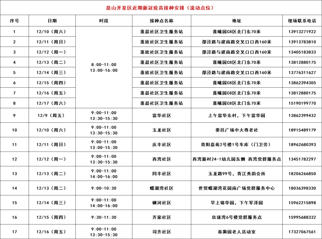 青阳新冠疫苗集中接种点 | 昆山市白墅路1006号 | 0512-5771 5803 | 8:00-11:00 13:00-16:00 | 3周岁以上人群 |