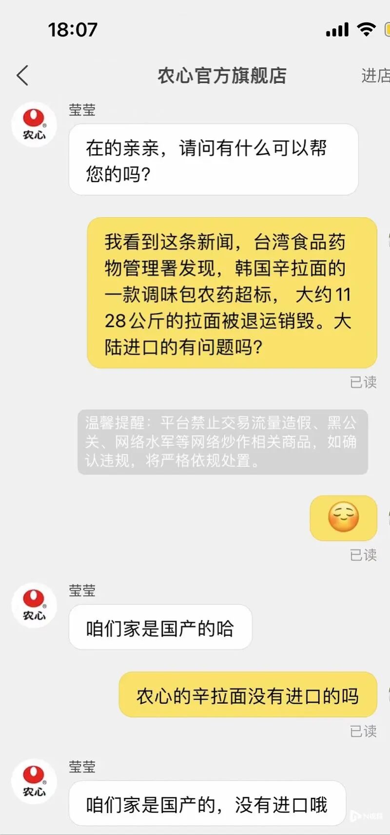 但在另一电商平台,南都·湾财社记者注意到,在农心官方旗舰店内,有标注“韩国进口”泡面等在售,客服告诉南都·湾财社记者,针对新闻提及的问题,暂时没有接到相关的通知。