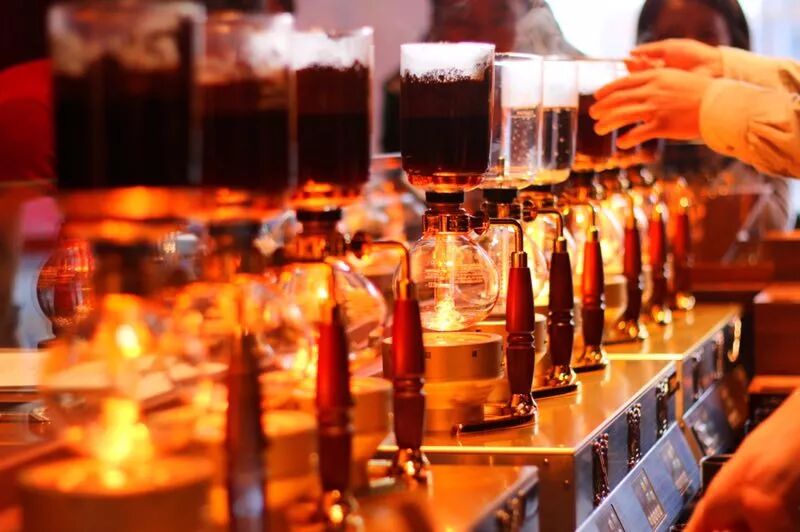 最让人惊艳的是这九台虹吸咖啡壶的制作过程,当火光照亮玻璃管的瞬间,所有围观的人都忍不住惊叹一句“神奇”。咖啡师说,这里光一台虹吸咖啡壶就价值十几万。