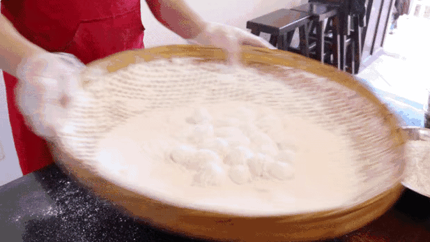 这里的元宵不同于上海的单馅元宵,里面有花生,芝麻,葱头,猪油,简直是热量炸弹。但真的好吃,经过“干搅”和“湿搅”后,将“炸弹”成型,最后将糯米粉“滚”出一个个可爱的元宵。